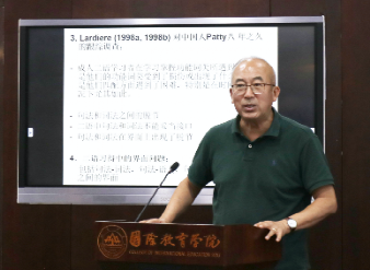 袁博平从成人二语习得和儿童母语习得的差异出发,讨论关键期对成人二语学习者掌握功能词类的影响。他从成人二语学习者在学习功能词类时存在困难的学理探究引入,深入到二语习得中的界面问题,并以二语习得汉语不及物动词为例,详细探讨二语习得中的句法-语义界面机理,并分享了团队最新实证研究成果。他指出,通过对英语母语者学习汉语的实际案例分析发现,绝大多数的受试者在建立语义和句法之间的界面关系方面存在显著困难,即使最高级阶段的学习者亦如此。对界面问题的探讨为汉语二语教学和习得研究提供了新的视角,在场师生深受启发。