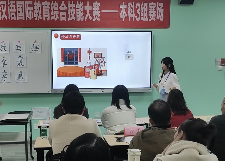 此次大赛通过在线直播教学、在线理论考试、中国文化短视频创作、教学技能现场展示及中英文问答等环节,对选手的专业素养、文化理解与创新表达能力、团队协作及应变能力进行全面而深入的考察。在刘冰冰、陈鹤龄、孙雪霄三位老师的悉心指导下,三位参赛同学对比赛的各个环节进行了充分准备。从教学设计到课件打磨,从文化短视频创作到双语解说,从理论备考到实践应用,团队师生始终秉持着精益求精的态度,力求在每个环节中做到尽善尽美。