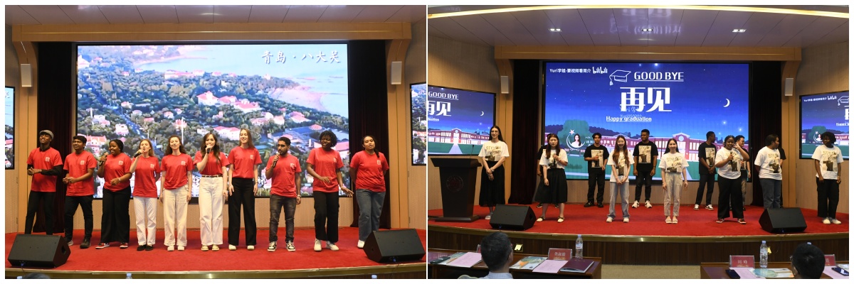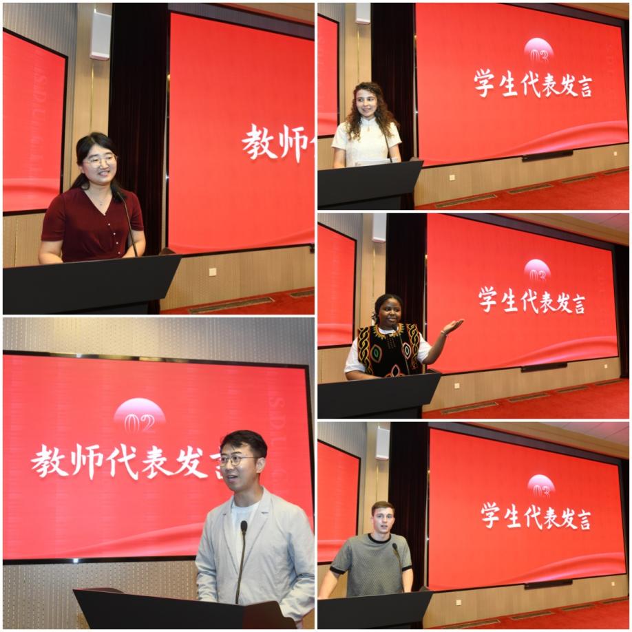 教师代表徐贺君和孙腾飞分别发言,回顾了与同学们相处过程中的难忘瞬间,细数同学们克服语言障碍、文化差异、学业压力带来的挑战,表扬了大家为实现梦想作出的不懈努力,表达了看到学生们进步和成长的欣慰与骄傲,以及离别之际对学生的不舍与祝福。语言生李思(古巴)、预科生唢呐(喀麦隆)、校际交换生苏行简(俄罗斯)作为学生代表分别发言,讲述了自己从初到异国的紧张、忐忑,到熟悉环境、爱上中国的过程。他们在这里和来自不同的国家、说着不同的语言、有着不同文化背景的同学们一起学习,感受中文和中国文化的博大精深,这段经历让他们收获了友谊、找到了热爱,也学会了理解和包容。