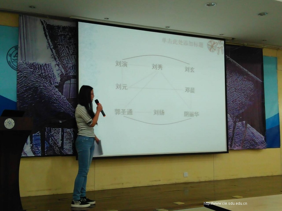 “三人行,必有我师”教学趣味模拟竞赛活动借鉴陕西卫视《超级老师》节目,旨在为同学们提供一个练习教学技能的平台。在第一轮比赛中,9位选手选择新颖有趣的话题,进行了精彩讲解。他们有的模拟了汉语教学的场景:刘真同学以海外幼儿为教学对象进行汉语教学,充满童趣的儿歌《什么好》带来欢笑;杜中玉则讲授了现代汉语中的一个修辞手法“仿拟”,以三毛与荷西的爱情故事作引,新颖独特,引人入胜。有的从现实生活中发掘教学话题:郑明月的“你有拖延症吗”将人性贪玩的一面比作“小猴子”,将最后期限比作“大魔王”,生动形象;李俊萱的“中西文化碰撞”讲述了中外交流中发生的趣事,告诉大家面对不同的文化要秉持“兼容并包”的态度;周冰玉“心理小课堂”以和颐酒店事件为切入点讲解了“公正世界信念”的概念与影响。有的以历史故事为题材:管璇借助大型古装电视连续剧《芈月传》为大家讲述了秦国的历史;李静茹则以“多情皇帝”为切入点讲述了光武帝刘秀与阴丽华的爱情故事。各位评委针对各位同学在第一轮中的表现给出了许多建议,如时间掌握、话题引入,课堂互动等。李俊萱、周冰玉、杜中玉、郑明月、刘真、王思维等6名同学晋级到第二轮。