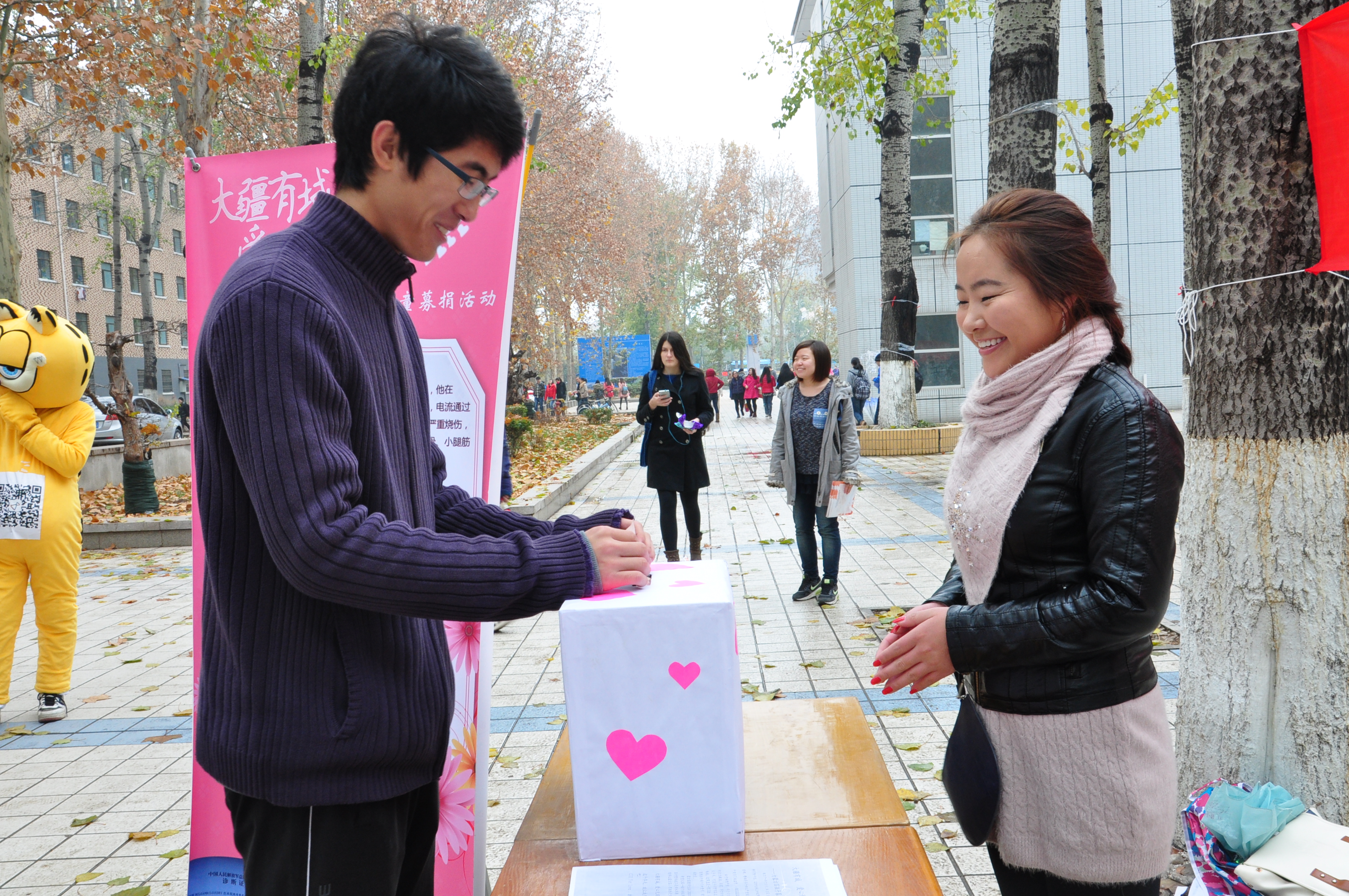 中午,随着人流渐渐的密集起来,志愿者们不遗余力地向四周来往的人们介绍募捐活动,发放宣传单页,耐心解释活动详情。很多老师、同学们纷纷放慢了脚步,向募捐箱里奉献自己的爱心。“十元、二十元、一百元...”这阵阵的爱意温暖了在场的每一位工作人员。热心的保安大爷在听完活动介绍后也上前献出了自己的一点心意;“大手拉小手”,接力传递爱心,一位老奶奶同小孙子一起,将善款放入募捐箱中;“爱心无国界”,一名来自泰国的留学生将自己身上的零钱全部捐出。