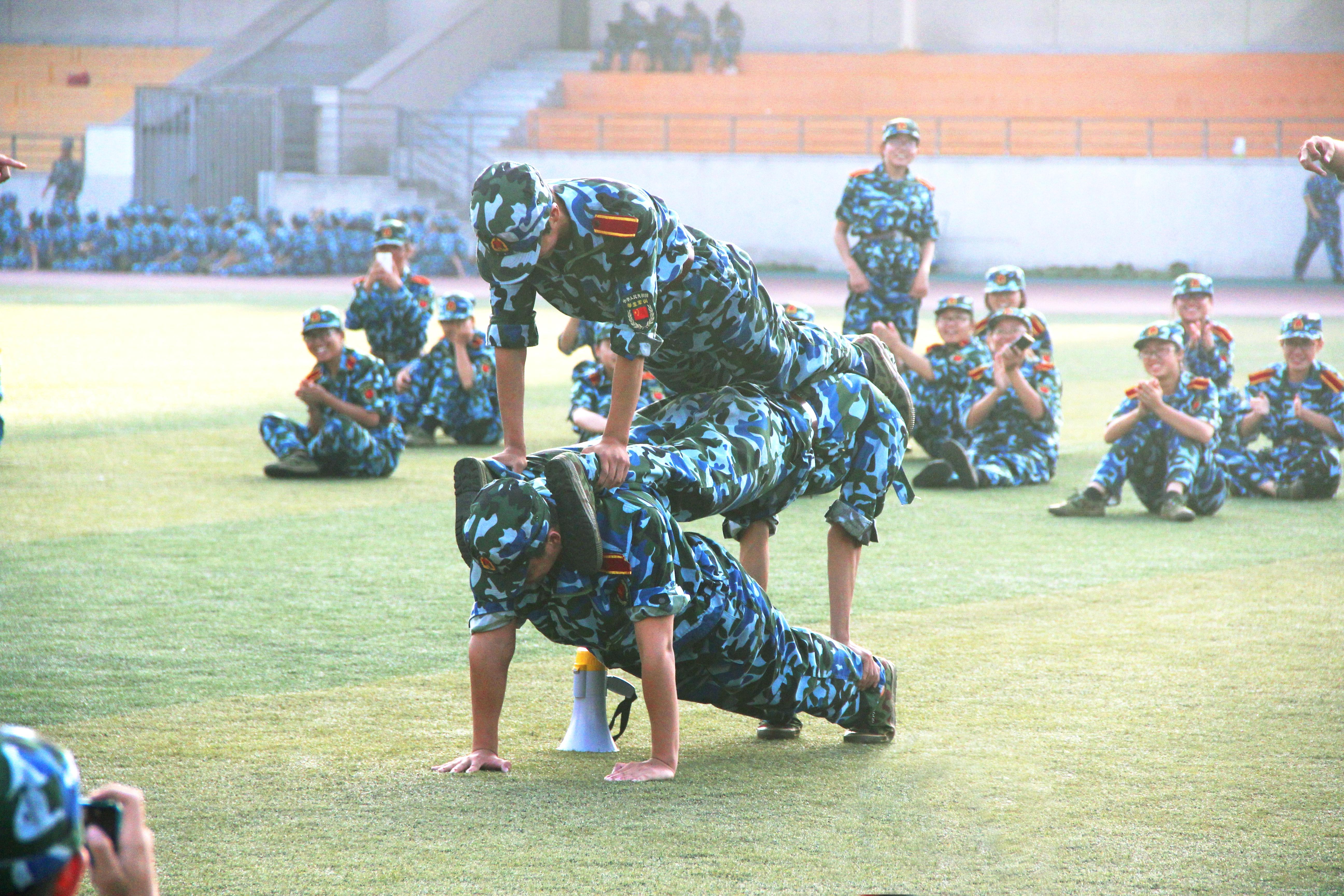 流淌的汗滴、磨破的鞋垫、黝黑的面庞,这一些点点滴滴,与同学们一起见证了军训的辛苦。然而,苦中有乐,军训中的每一次欢声笑语,每一次同窗之情,每一天的微风暖月,也在为同学们创造着美丽的回忆。随着时间,这些念念不忘的小时光,会愈加显露出它们的光芒。这是军训休息时的片刻瞬间,可爱的新同学们,为了排解训练的苦闷,想出可爱的小点子为同学们制造出欢乐。同学们都露出了灿烂的笑容,发出了悦耳的笑声。看着最下面的男生奋力地用自己的力量撑起上面的两个同学,也是令人十分敬佩。