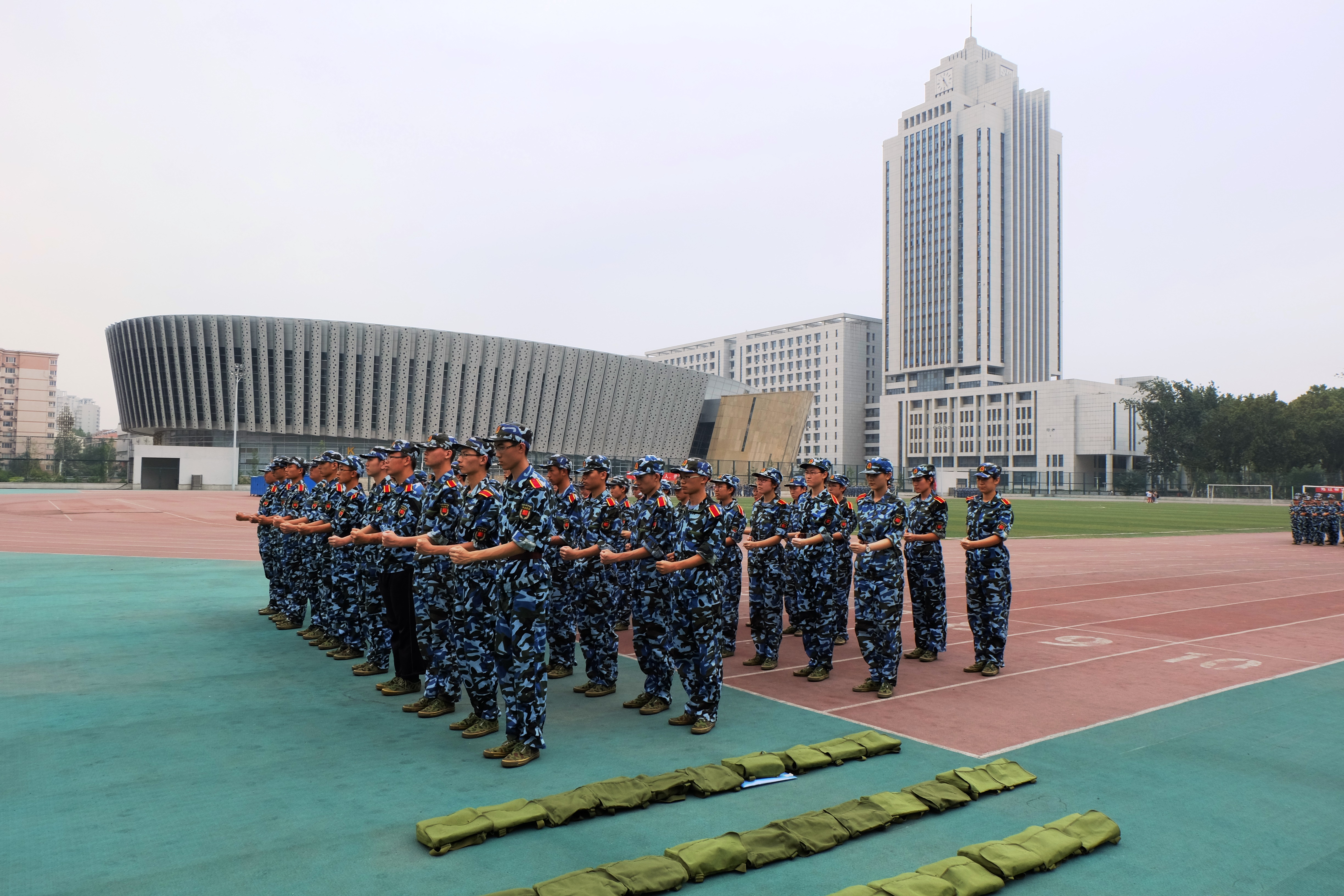 连续的雨天终于过去,迎来了晴天。早上雾还未散去,中心校区的操场上,已经充斥着绿色军营的味道,活跃着大一同学们青春的身影。这是军训正在进行中。